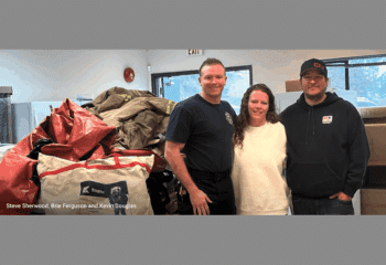 Steven Santelli and Brie Ferguson gather firefighting safety gear that will help communities protect their loved ones