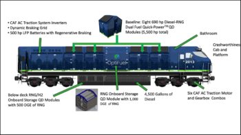 OptiFuel Systems LLC is offering a new line of Total-ZeroTM Diesel Hybrid and Total-ZeroTM Diesel-RNG Dual Fuel Hybrid Series Locomotives it says “eliminates the need for a fuel tender in zero-emission line…