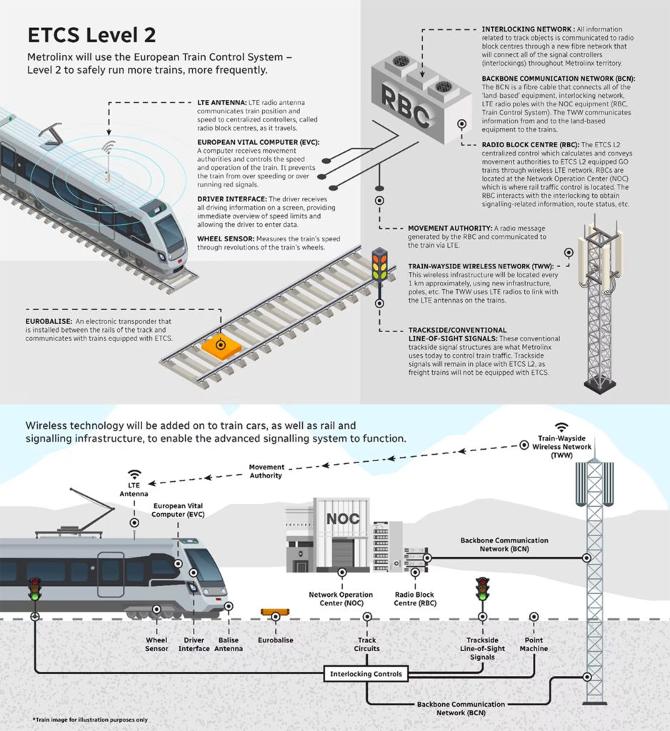 ETCS Level 2, which Metrolinx calls “Enhanced Train Control” (ETC) is an overlay CBTC (communications-based train control) system that communicates train speed, location and movements across a rail network. It calculates and exchanges information in real-time between onboard equipment and wayside infrastructure through wireless Long-Term Evolution (LTE) radio technology. The wayside equipment acts as a centralized control system to monitor and manage rail traffic. Continuous wayside-to-train radio communication “ensures safe and efficient train operation, allowing the advanced signaling system to deliver safe, fast, frequent, and high-capacity train service,” said Metrolinx Vice President Technical Systems Integration Jonita Delaney. “Enhanced Train Control is the future of railway signallng systems, enabling operators to safely increase capacity and decrease journey times. “Metrolinx has selected ETCS L2 based on its suitability to operating model and the safety benefits it will bring to passengers, railway workers and level crossings.”