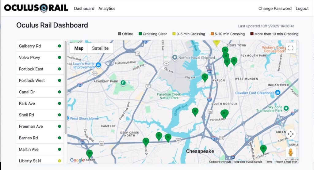 “I frequently hear from constituents how frustrating it is to be stuck at a rail crossing with no idea how long they’ll be waiting. Oculus Rail gives the city—and our residents, business owners and visitors—real-time insight we’ve never had before. It’s helping us respond faster, plan smarter, and finally address one of the most common complaints we get,” added Norfolk City Councilmember Jeremy McGee.