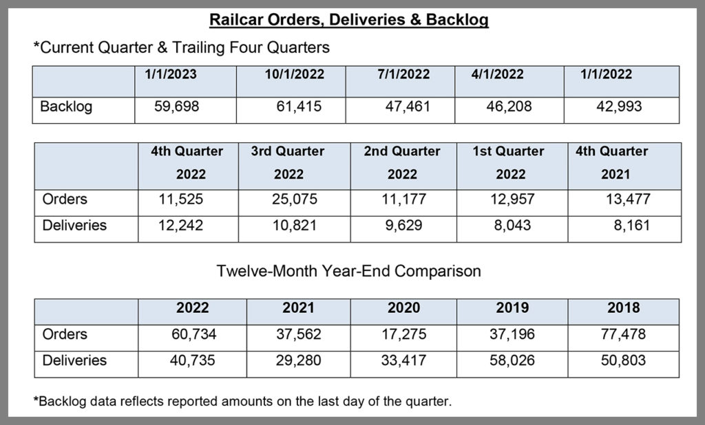 Overall freight railcar deliveries in 2022’s fourth quarter increased by approximately 13% over 3Q22, but orders fell 57%. The backlog fell slightly, by 4%, the Railway Supply Insitute (RSI) American Railway Car Institute Committee (ARCI) reported on Jan. 27.