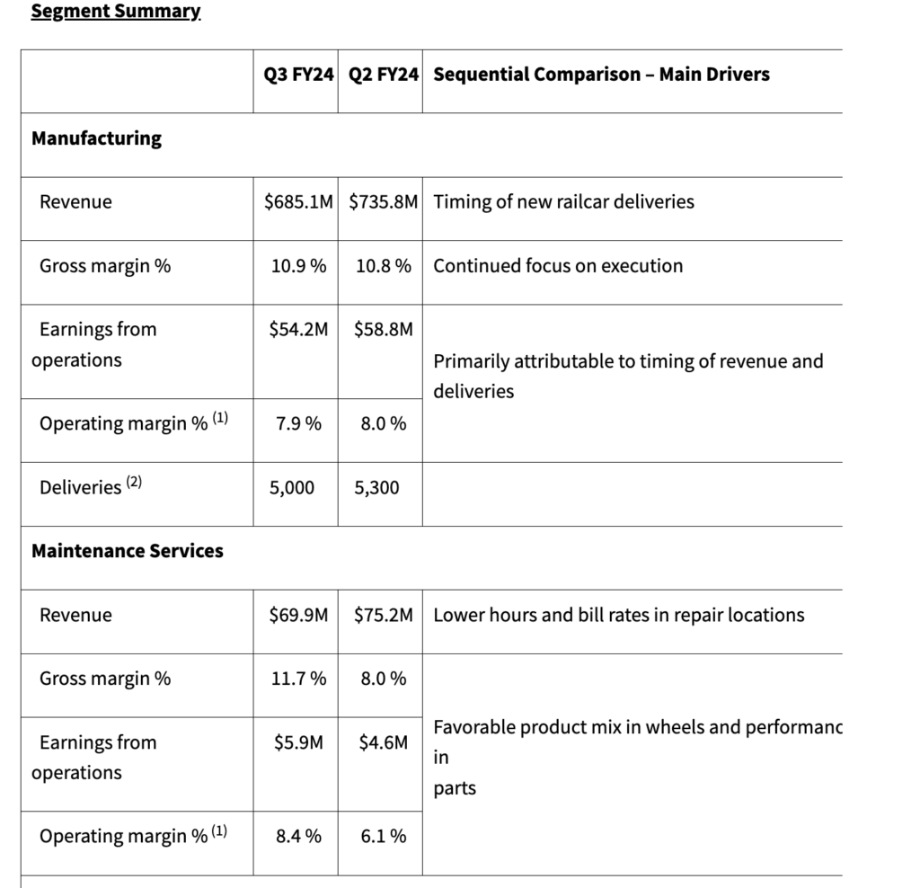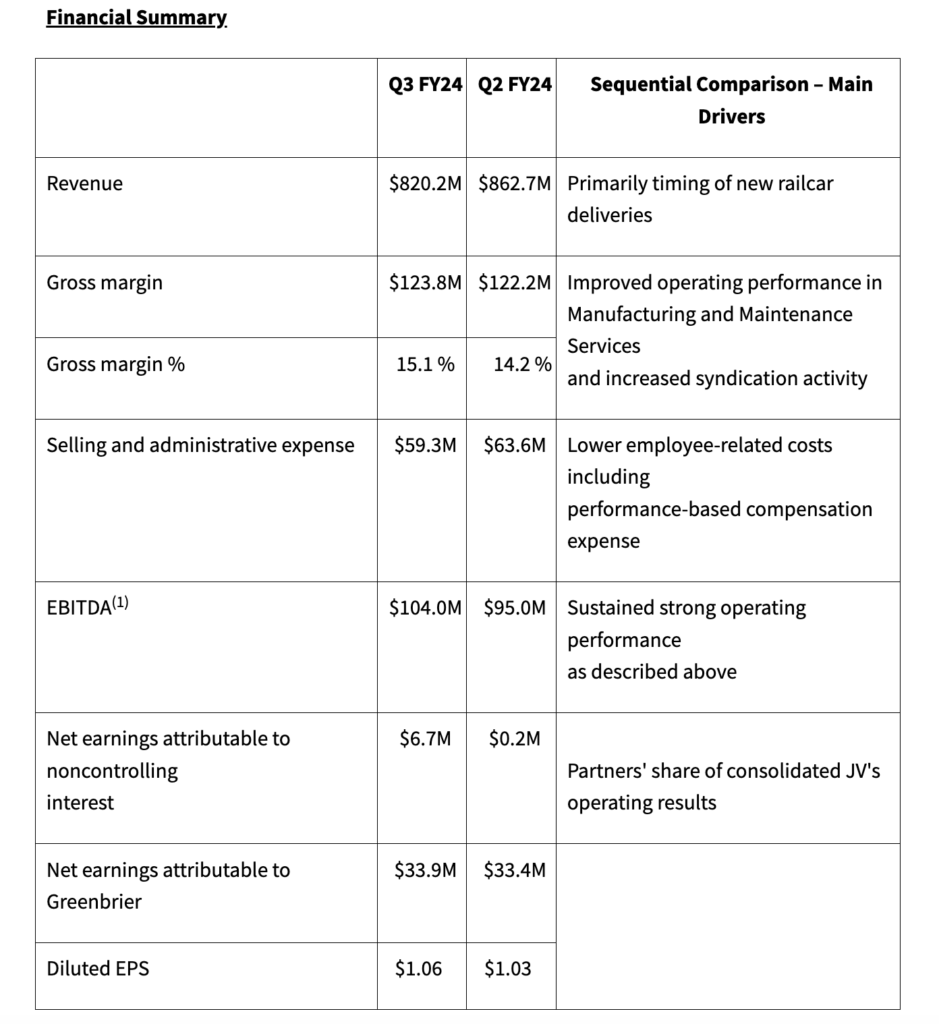 Following are highlights of Greenbrier’s third fiscal quarter 2024: