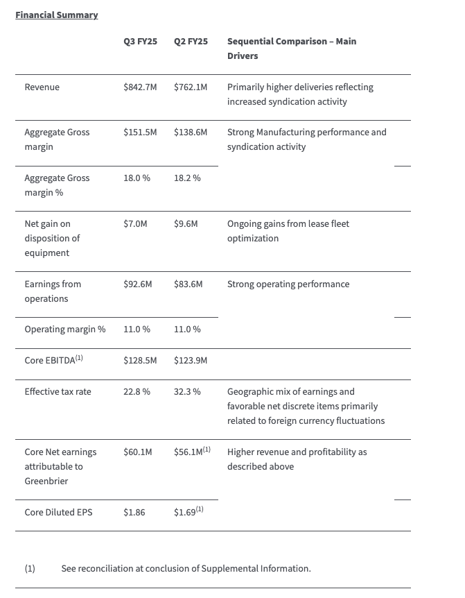 Following are highlights of Greenbrier’s third fiscal quarter 2025: