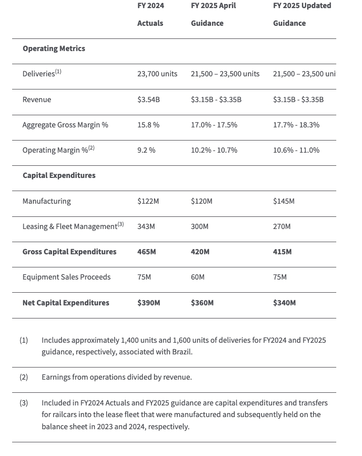 Based on current trends and production schedules, Greenbrier is updating its guidance for fiscal 2025: