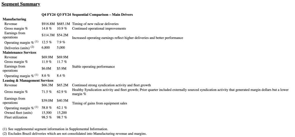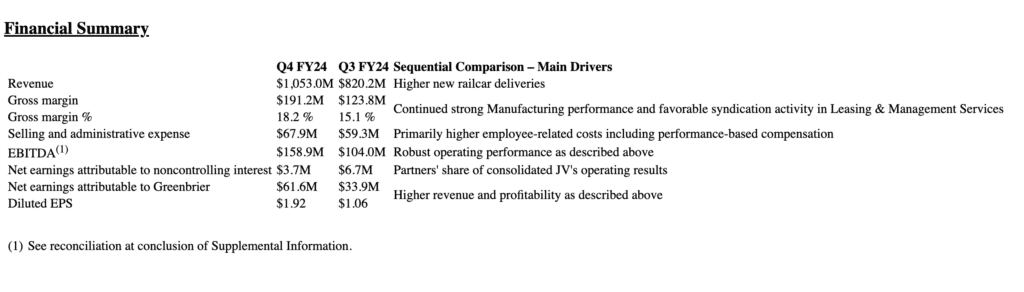 • Second-highest annual operating cash flow in Greenbrier history – Q4 and Fiscal 2024 operating cash flow reaches $192 million and $330 million, respectively.