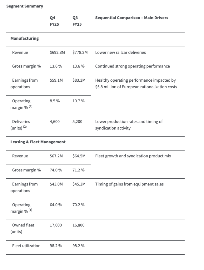 “As we enter fiscal 2026, we are navigating the current North American and European freight rail markets with a resilient business model, growing lease fleet, and continued productivity gains. We will continue to focus on operational efficiencies and execution to deliver higher through-cycle profitability and long-term shareholder value across market conditions,” concluded Tekorius.