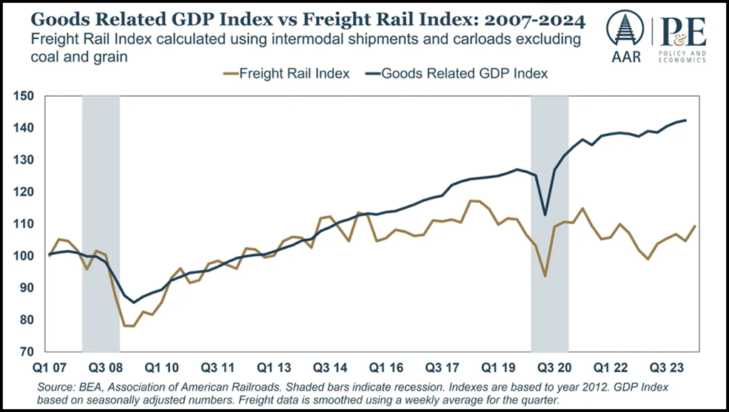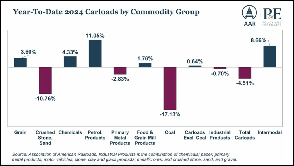 - “June rail data, closely tied to economic performance, suggests a cautiously optimistic outlook for economic growth amid prevailing uncertainty. Potential interest rate cuts later in 2024 or early 2025 are expected to stimulate industrial output, which has historically driven growth in rail carload volumes across key commodities.”