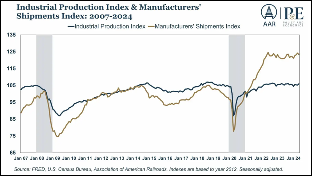 - “Recent data indicating an uptick in industrial output brings a beacon of hope, hinting at a possible end to the prolonged manufacturing slowdown. If this activity continues, rail volumes for raw materials and finished goods are likely to follow.”