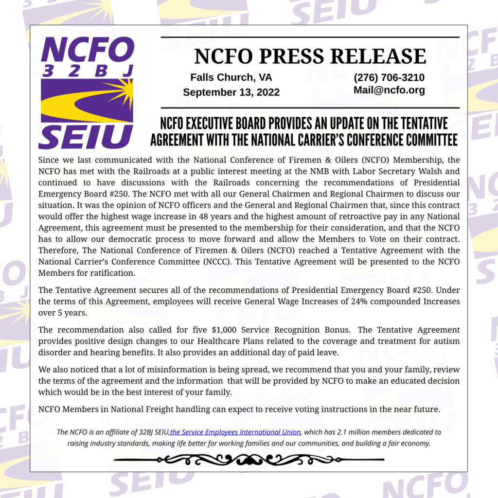 The 12* labor organizations at the bargaining table represent 125,000 unionized workers affected by the negotiations. In addition to NCFO, the following have also inked tentative agreements with NCCC: the Brotherhood of Maintenance of Way Employees Division (BMWED); International Brotherhood of Boilermakers (IBB); International Association of Sheet Metal, Air, Rail and Transportation Workers-Mechanical Department (SMART-MD); American Train Dispatchers Association (ATDA); International Association of Machinists and Aerospace Workers (IAM); International Brotherhood of Electrical Workers (IBEW); and the Transportation Communications Union (TCU, including its allied Brotherhood Railway Carmen).
