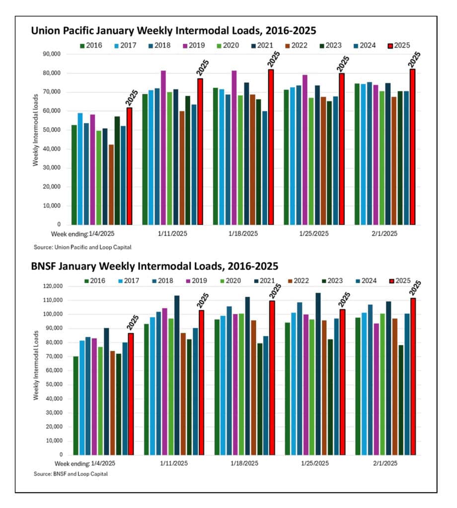 Union Pacific moved 87,788 units in the week prior to the cold snap, which slowed to 79,957 during the weather event, before reaccelerating to 82,244 in the week ending Feb. 1. January load growth was 20% YoY. The numbers for BNSF were 109,453, 103,642 (cold snap) and 111,484 (reacceleration). January loads were up 12% YoY, but note it had a less easy 2024 comp compared to Union Pacific.