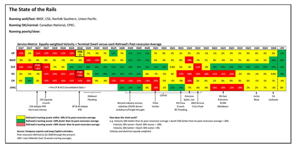 Norfolk Southern proved most resilient to the recent cold snap, at least according to the operating data, and in conjunction with an easy YoY operating comp posted a 7% improvement in both velocity and dwell in January. Operationally, this is the network on a hot streak as it catches up to the group off a lower base (2022 Service Crisis and 2023 East Palestine bottleneck). Against this big efficiency tailwind, we have, so far, modest volume headwind, with total loads down 2.3% QTD. Within this, intermodal is flat, but container volumes should improve as we move through the year as last year’s mix shift to the U.S. West coast (due to the East Coast port strike) normalizes.