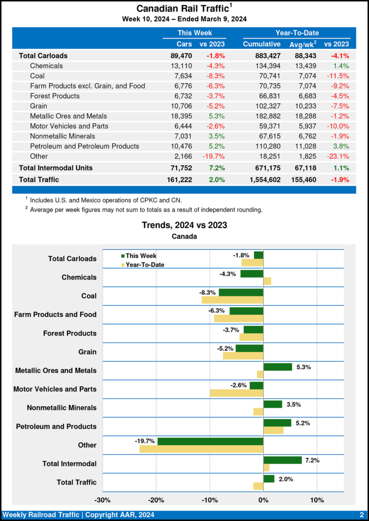 Canadian railroads reported 89,470 carloads for the week ending March 9, 2024, a 1.8% decrease, and 71,752 intermodal units, a 7.2% gain over the same week last year. For the first 10 weeks of 2024, they reported cumulative rail traffic volume of 1,554,602 carloads, containers and trailers, down 1.9%.
