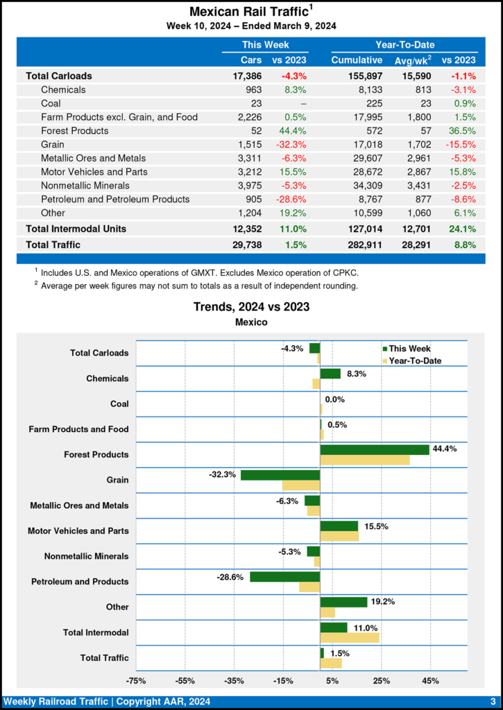 For the week ending March 9, 2024, Mexican railroads reported 17,386 carloads, down 4.3% from the prior-year period, and 12,352 intermodal units, up 11.0%. Their cumulative volume for the first 10 weeks of this year was 282,911 carloads and intermodal containers and trailers, increasing 8.8% from 2023.