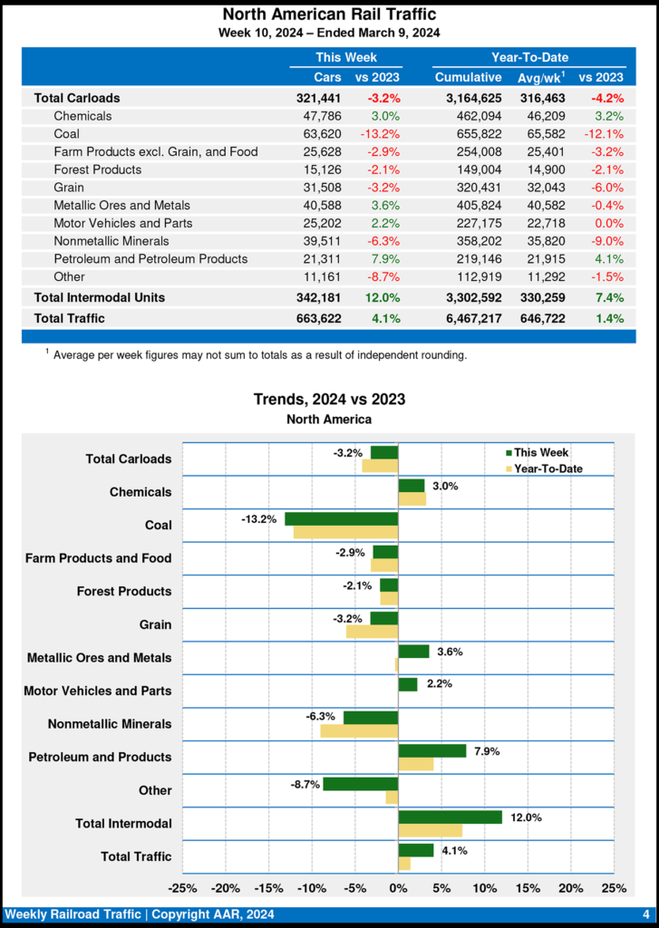 North American rail volume for the week ending March 9, 2024, on 12 reporting U.S., Canadian and Mexican railroads totaled 321,441 carloads, dipping 3.2% from the same week last year, and 342,181 intermodal units, rising 12.0% from last year. Total combined weekly rail traffic in North America was 663,622 carloads and intermodal units, up 4.1%. North American rail volume for the first 10 weeks of this year was 6,467,217 carloads and intermodal units, up 1.4% compared with 2023.
