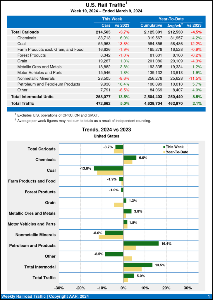 U.S. Class I railroads hauled 472,662 carloads and intermodal units for the week ending March 9, 2024—rising 5% from the same point last year, AAR reported March 13. Total carloads came in at 214,585, down 3.7% from 2023, while U.S. weekly intermodal volume was 258,077 containers and trailers, up 13.5% from 2023.