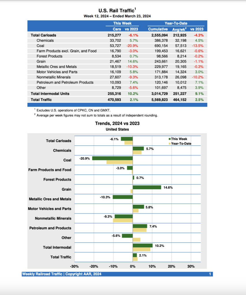U.S. Class I railroads hauled 470,593 carloads and intermodal units for the week ending March 23, 2024—rising 2.1% from the same point last year, AAR reported March 27. Total carloads came in at 215,277, down 6.1% from 2023, while U.S. weekly intermodal volume was 255,316 containers and trailers, up 10.2% from 2023.