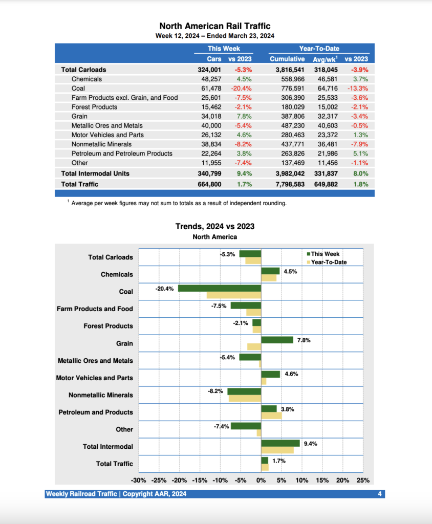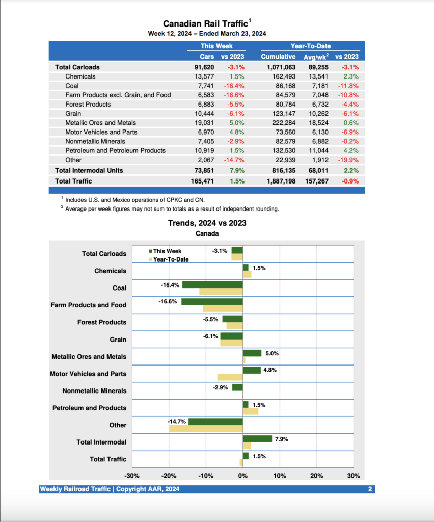 Canadian railroads reported 91,620 carloads for the week, down 3.1%, and 73,851 intermodal units, up 7.9% compared with the same week in 2023. For the first 12 weeks of 2024, Canadian railroads reported cumulative rail traffic volume of 1,887,198 carloads, containers and trailers, down 0.9%.