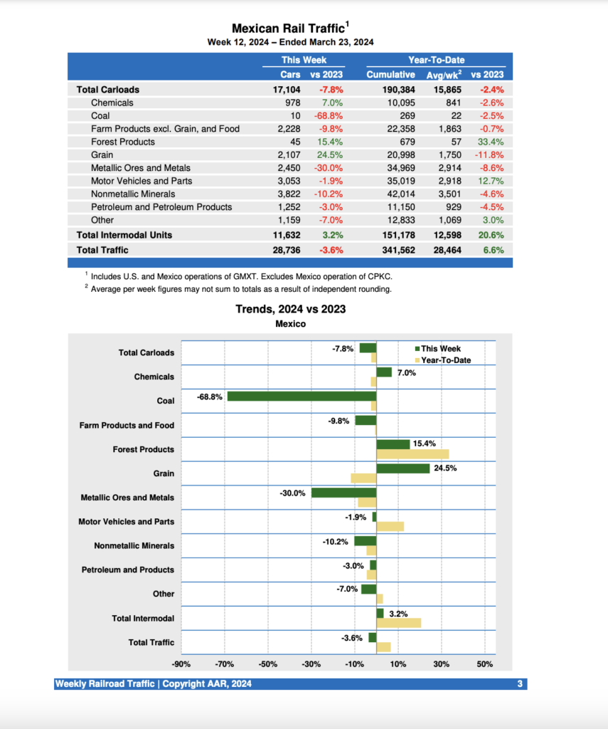 Mexican railroads reported 17,104 carloads for the week, down 7.8% compared with the same week last year, and 11,632 intermodal units, up 3.2%. Cumulative volume on Mexican railroads for the first 12 weeks of 2024 was 341,562 carloads and intermodal containers and trailers, up 6.6% from the same point last year.
