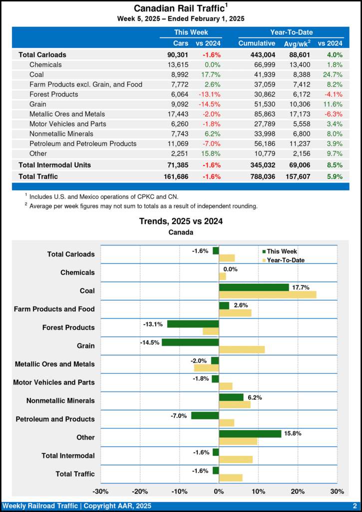 Canadian railroads reported 90,301 carloads for the week ending Feb. 1, 2025, a 1.6% drop-off, and 71,385 intermodal units, a 1.6% drop-off compared with the same week in 2024. For the first five weeks of this year, they reported cumulative rail traffic volume of 788,036 carloads, containers, and trailers, up 5.9% from the prior-year period.