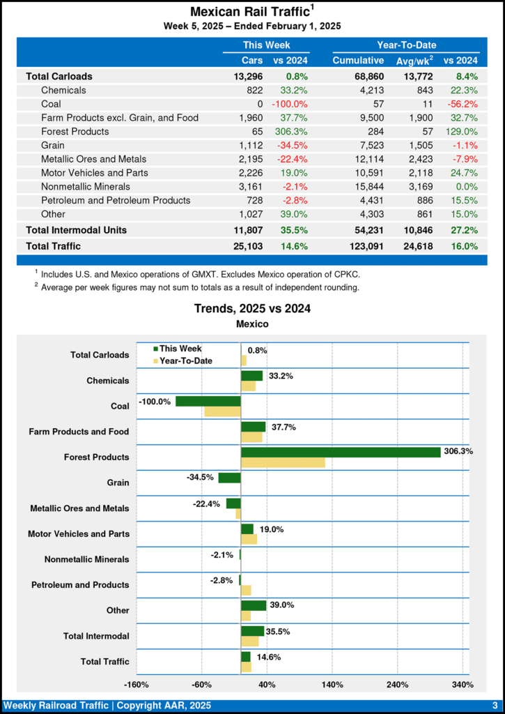 For the week ending Feb. 1, 2025, Mexican railroads reported 13,296 carloads, up 0.8% from the year-ago period, and 11,807 intermodal units, up 35.5%. Their cumulative volume for the first five weeks of 2025 came in at 123,091 carloads and intermodal containers and trailers, rising 16.0% from last year.