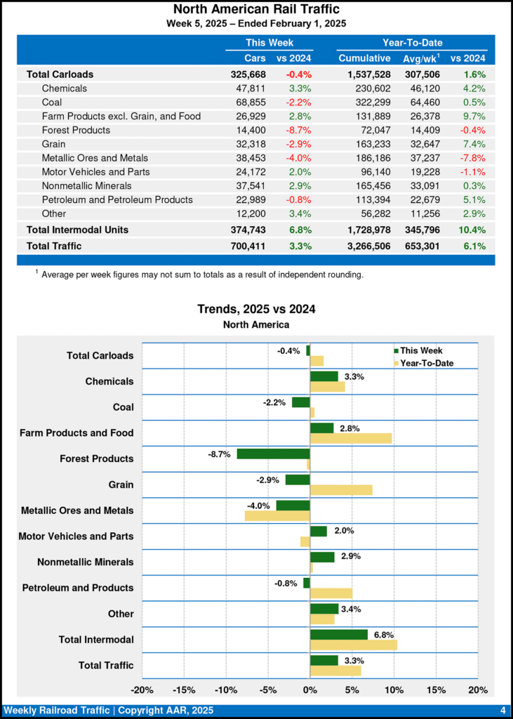 North American rail volume for the week ending Feb. 1, 2025, on nine reporting U.S., Canadian and Mexican railroads totaled 325,668 carloads, down 0.4% from the same week last year, and 374,743 intermodal units, up 6.8% from last year. Total combined weekly rail traffic in North America was 700,411 carloads and intermodal units, up 3.3%. North American rail volume for the first five weeks of this year was 3,266,506 carloads and intermodal units, an increase of 6.1% over 2024.