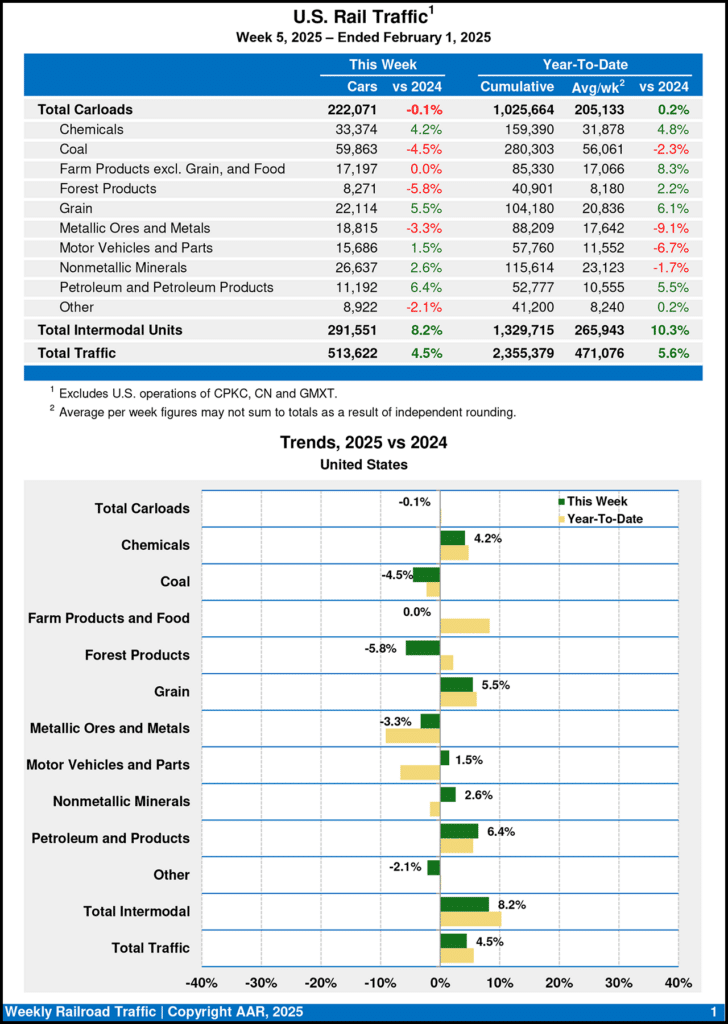 U.S. Class I railroads hauled 513,622 carloads and intermodal units for the week ending Feb. 1, 2025, the AAR reported Feb. 5. Total carloads came in at 222,071, dipping 0.1%, while intermodal volume was 291,551 containers and trailers, rising 8.2% from the same week in 2024.