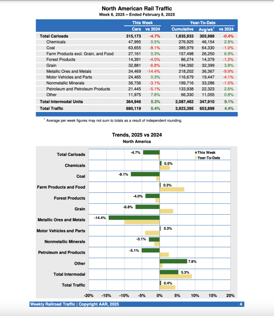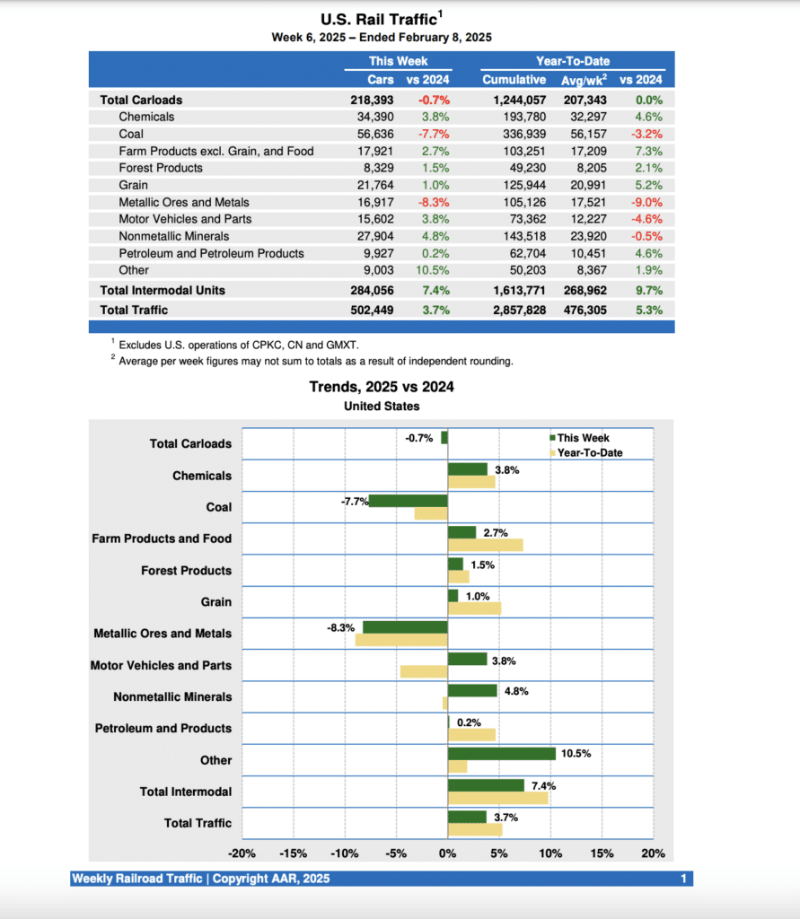 Total U.S. rail traffic for the week ending Feb. 8, 2025 (Week 6) was up 3.7% from the prior-year period, with intermodal gains offsetting carload losses, according to the Association of American Railroads’ (AAR) latest report.