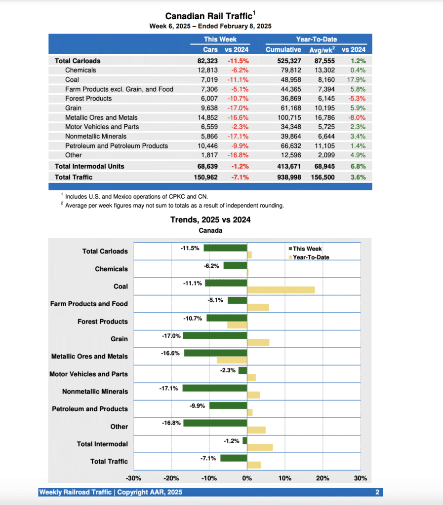Canadian railroads reported 82,323 carloads for the week ending Feb. 8, 2025, an 11.5% drop-off, and 68,639 intermodal units, a 1.2% drop-off compared with the same week in 2024. For the first six weeks of this year, they reported cumulative rail traffic volume of 938,998 carloads, containers, and trailers, up 3.6% from the prior-year period.