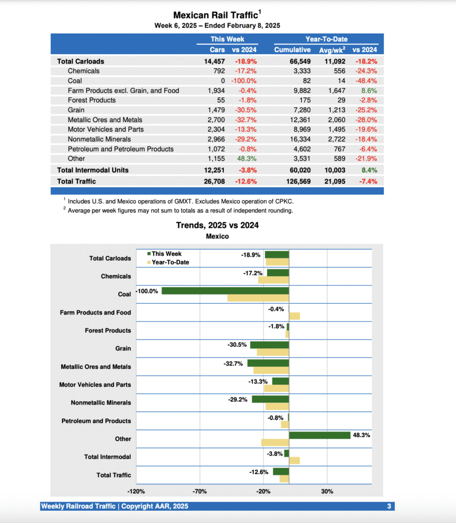 For the week ending Feb. 8, 2025, Mexican railroads reported 14,457 carloads, down 18.9% from the year-ago period, and 12,351 intermodal units, down 3.8%. Their cumulative volume for the first six weeks of 2025 came in at 126,569 carloads and intermodal containers and trailers, dropping 7.4% from last year.