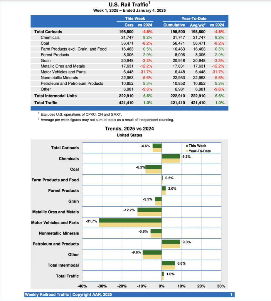 U.S. Class I railroads hauled 421,410 carloads and intermodal units for the week ending Jan. 4, 2025, the AAR reported Jan. 8. Total carloads came in at 198,500, dipping 4.6%, while intermodal volume was 222,910 containers and trailers, rising 6.6% from the same week in 2024.