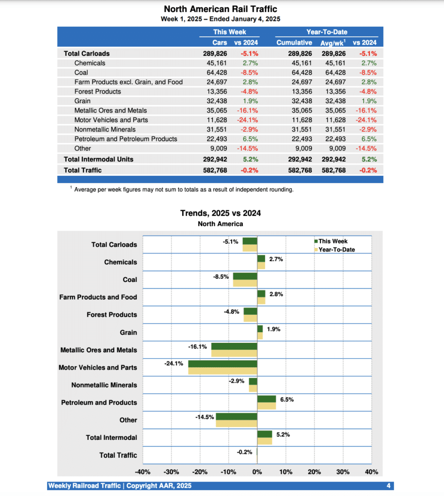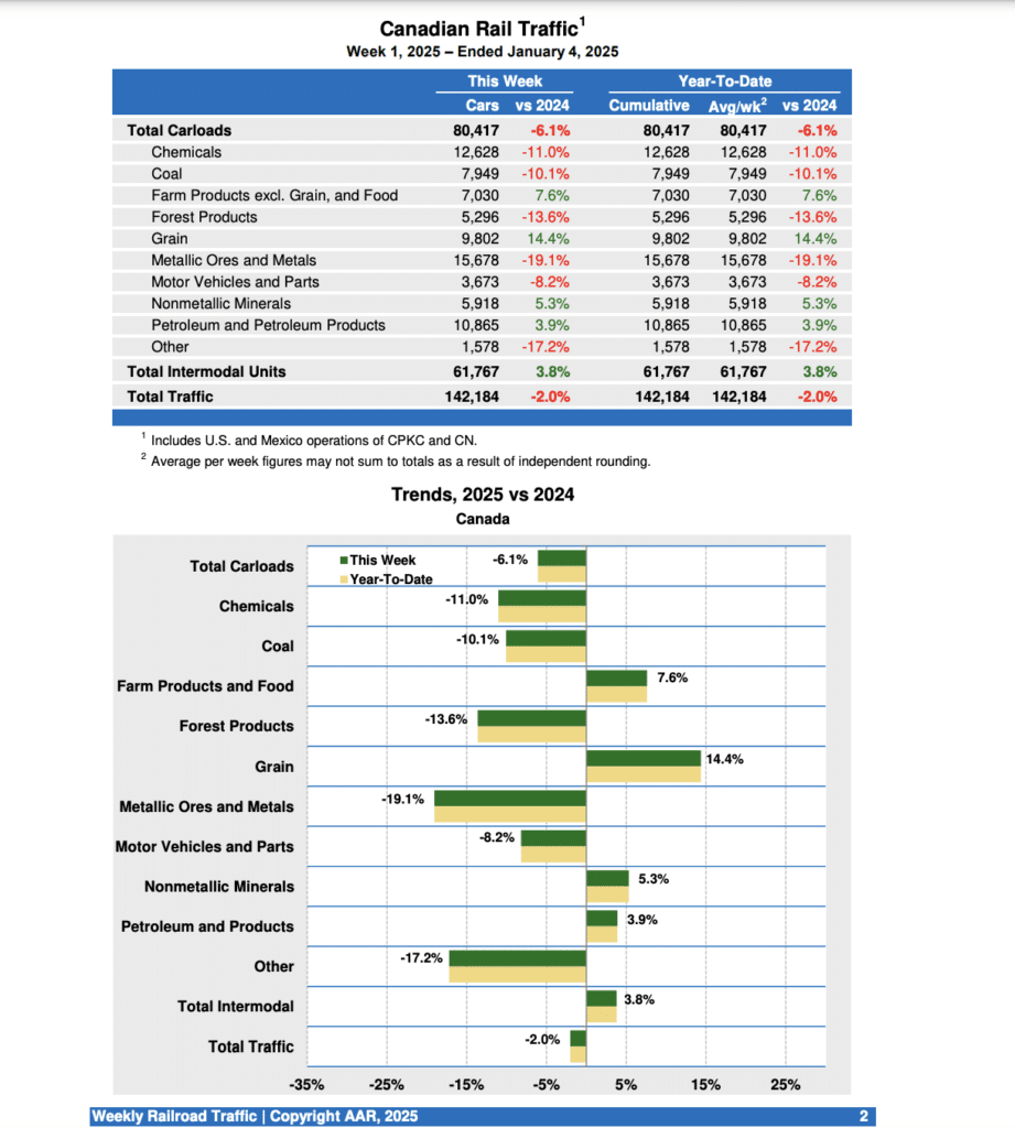 Canadian railroads reported 80,417 carloads for the week, down 6.1%, and 61,767 intermodal units, up 3.8% compared with the same week in 2024. For the first week of 2025, Canadian railroads reported cumulative rail traffic volume of 142,184 carloads, containers and trailers, down 2.%.