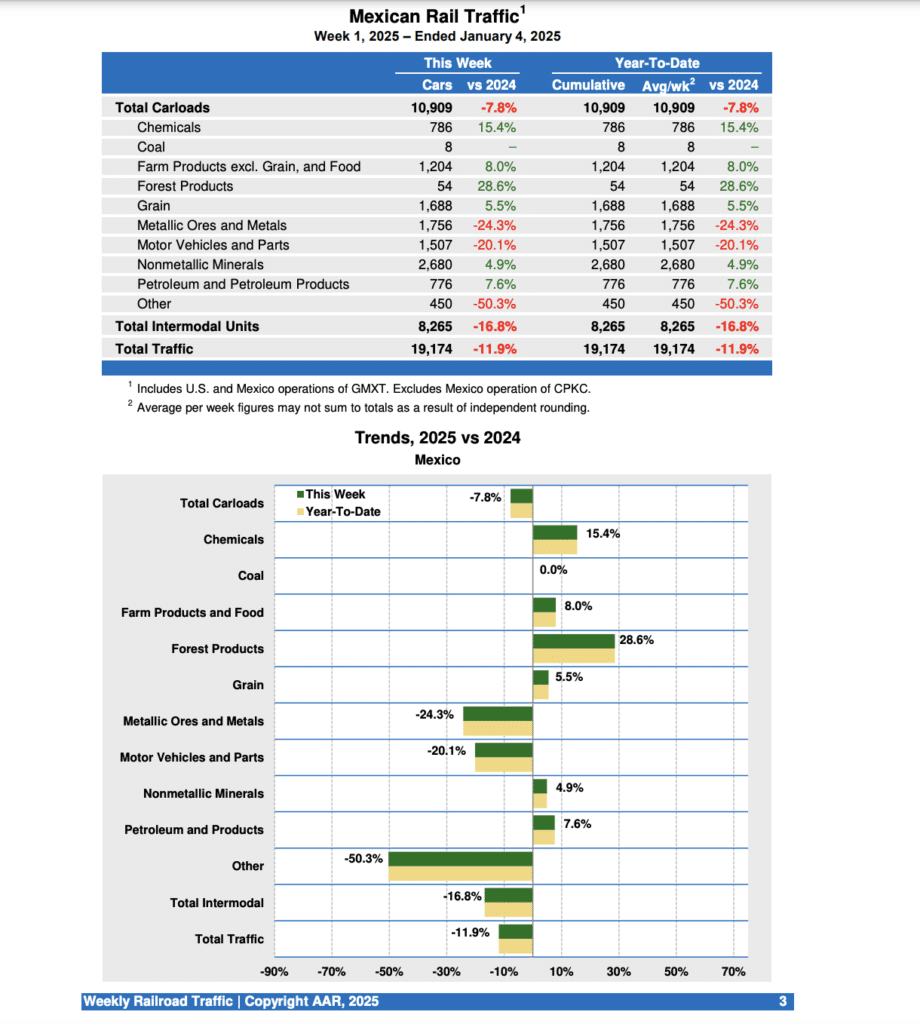 Mexican railroads reported 10,909 carloads for the week, down 7.8% compared with the same week last year, and 8,265 intermodal units, down 16.8%. Cumulative volume on Mexican railroads for the first week of 2025 was 19,174 carloads and intermodal containers and trailers, down 11.9% from the same point last year.