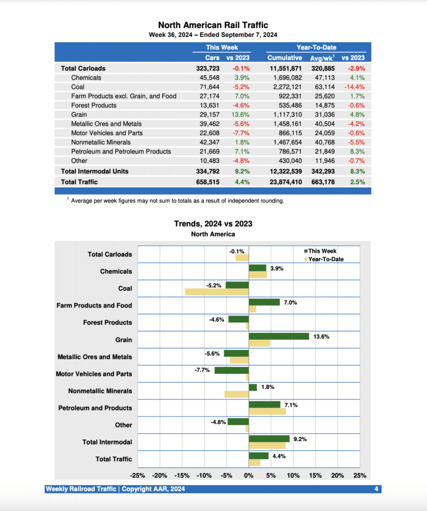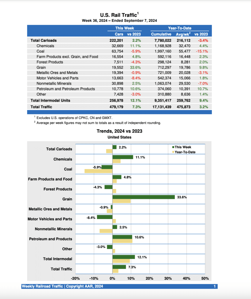 Weekly rail traffic volumes are up again over the prior-year period, according to the latest Association of American Railroads (AAR) report, but Week 36 (ending Sept 7, 2024) was the fourth in a row to see gains in carloads and intermodal units.