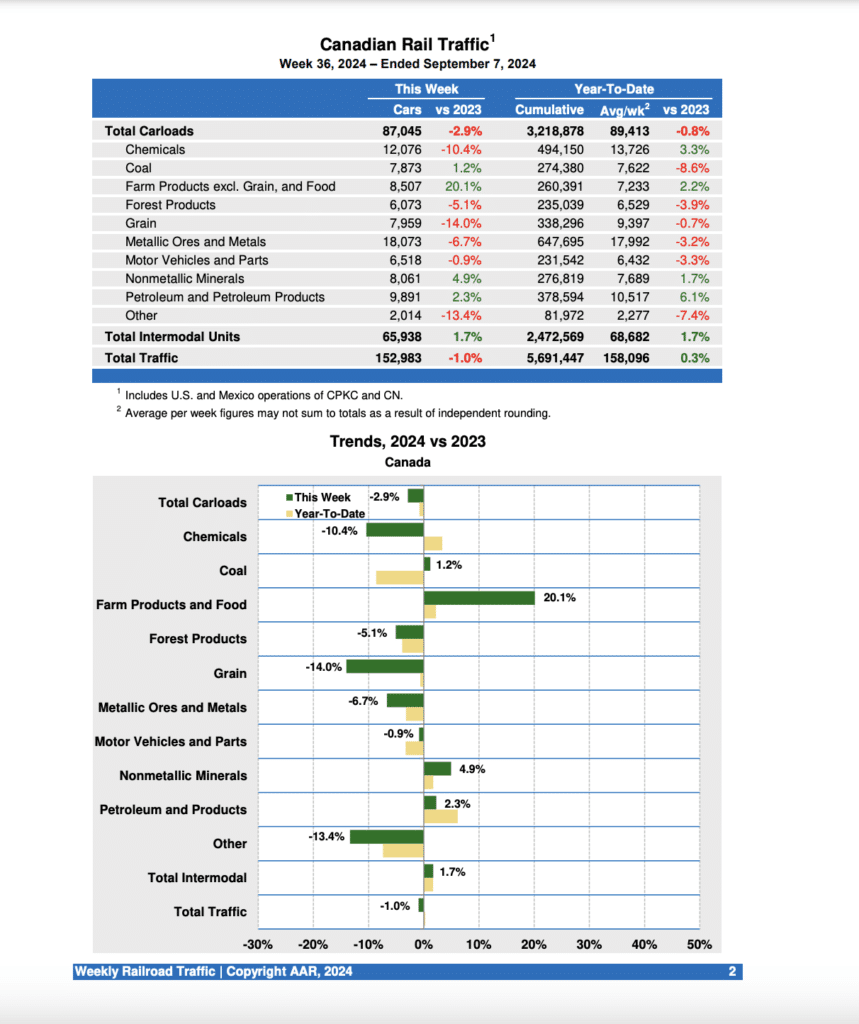 Canadian railroads reported 87,045 carloads for the week ending Sept. 7, 2024, a 2.9% decrease, and 65,938 intermodal units, up 1.7% compared with the same week in 2023. For the first 36 weeks of this year, they reported cumulative rail traffic volume of 5,691,1447 carloads, containers and trailers, up 0.3%.