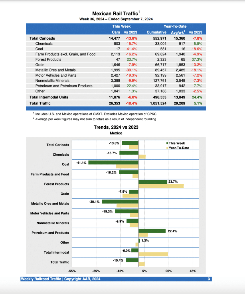 For the week ending Sept. 7, 2024, Mexican railroads reported 14,477 carloads, down 13.8% from the same period last year, and 11,876 intermodal units, falling 6.0%. Their cumulative volume for the first 36 weeks of this year was 1,051,524 carloads and intermodal containers and trailers, up 5.1% from the prior-year period.