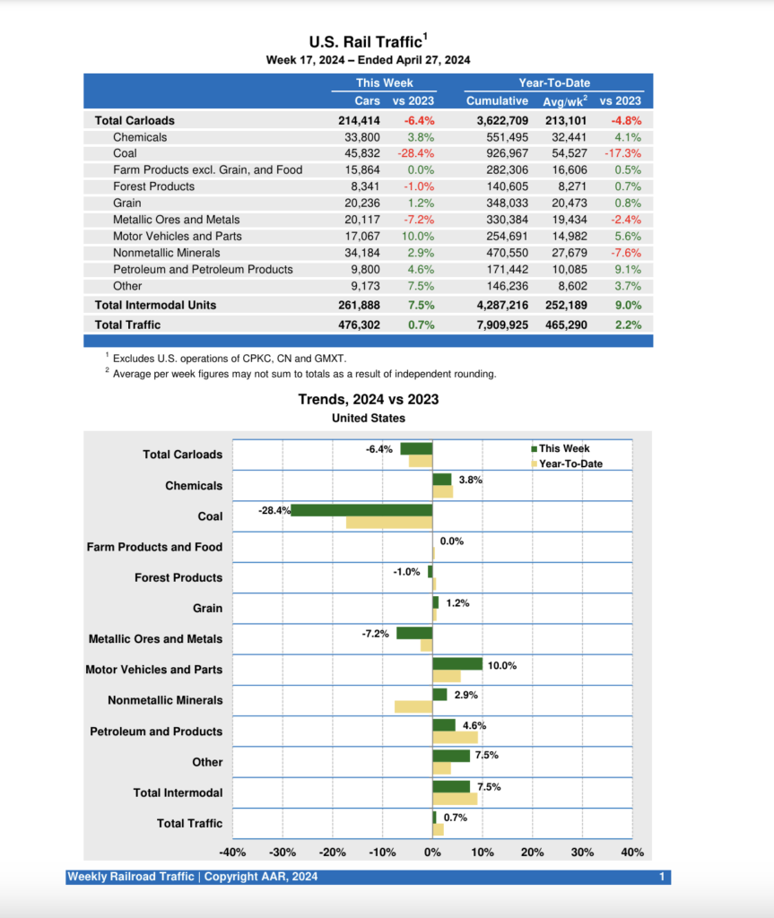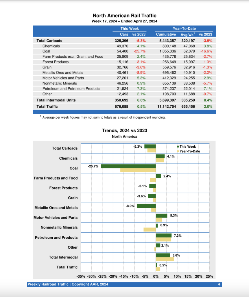For the week ending April 27, 2024 (Week 17), total U.S. weekly rail traffic was up 0.7% compared with the same week last year; carloads were down 6.4% and intermodal was up 7.5%.