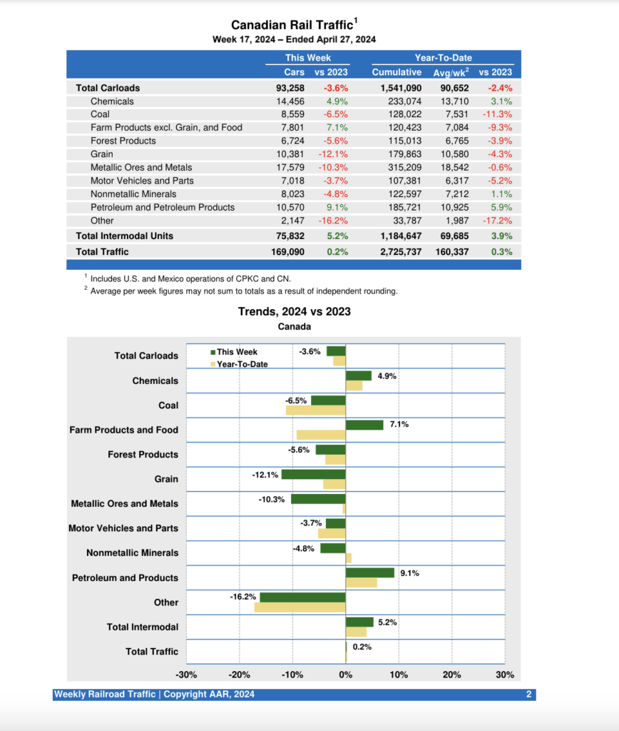 Canadian railroads reported 93,258 carloads for the week, down 3.6%, and 75,832 intermodal units, up 5.2% compared with the same week in 2023. For the first 17 weeks of 2024, Canadian railroads reported cumulative rail traffic volume of 2,725,737 carloads, containers and trailers, up 0.3%.