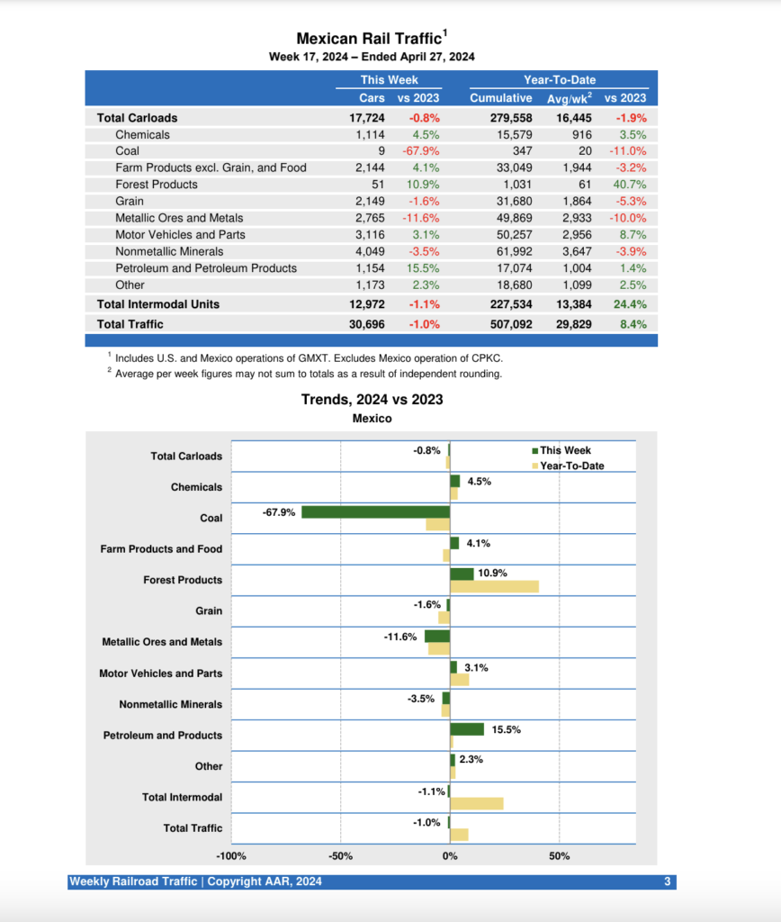Mexican railroads reported 17,724 carloads for the week, down 0.8% compared with the same week last year, and 12,972 intermodal units, down 1.1%. Cumulative volume on Mexican railroads for the first 17 weeks of 2024 was 507,092 carloads and intermodal containers and trailers, up 8.4% from the same point last year.