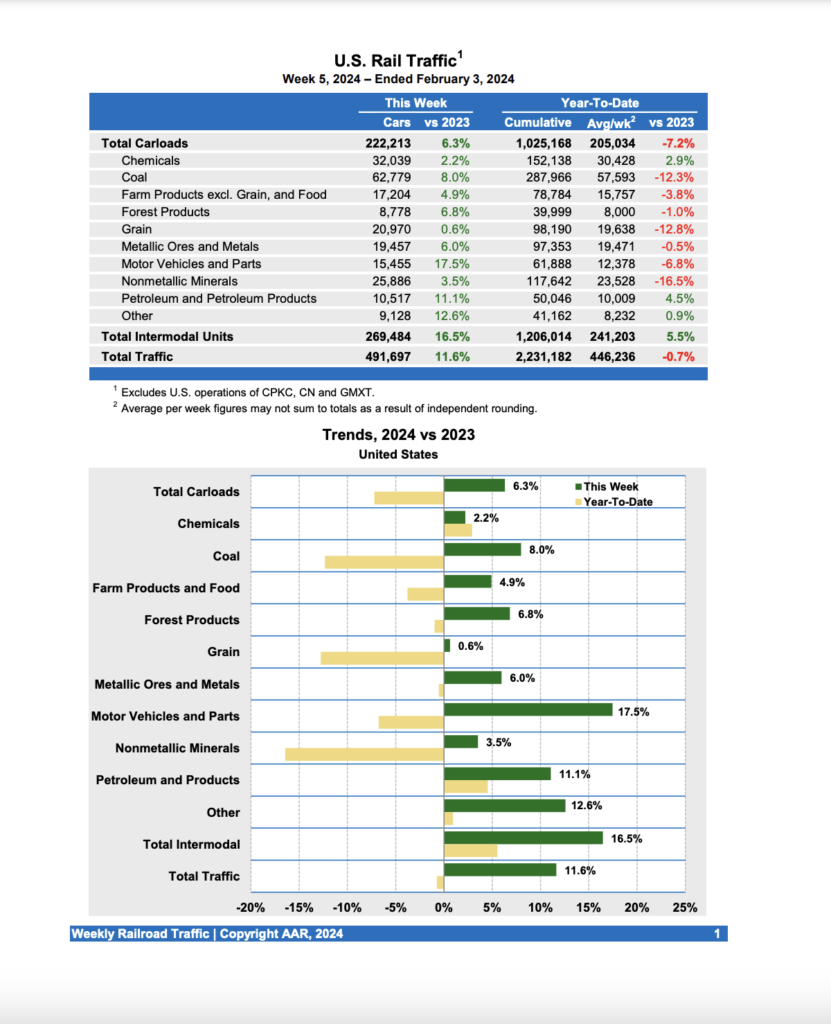 For the week ending Feb. 3, 2024 (Week 5), total U.S. rail traffic was up 11.6% compared with the same week last year; carloads were up 6.3% and intermodal was up 16.5% compared to 2023.