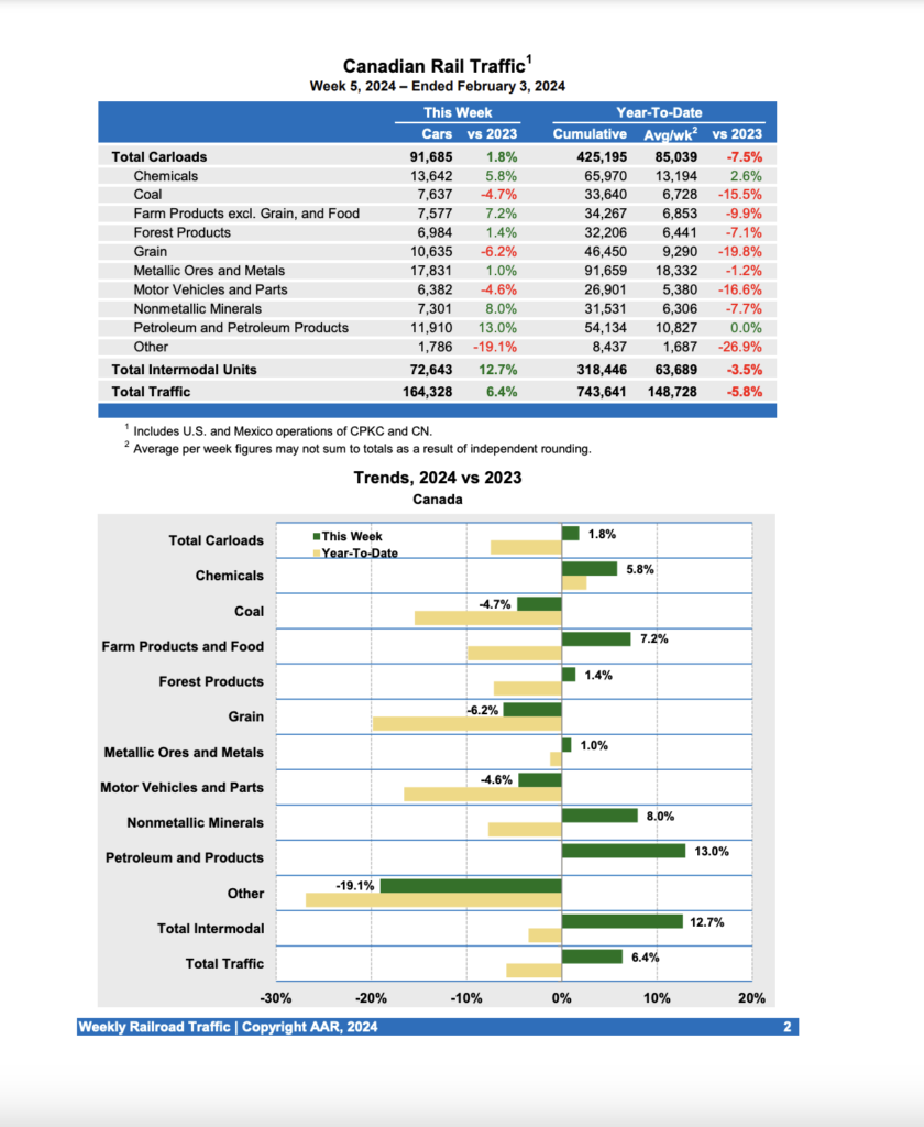 Canadian railroads reported 91,685 carloads for the week, up 1.8%, and 72,643 intermodal units, up 12.7% compared with the same week in 2023. For the first five weeks of 2024, Canadian railroads reported cumulative rail traffic volume of 743,641 carloads, containers and trailers, down 5.8%.
