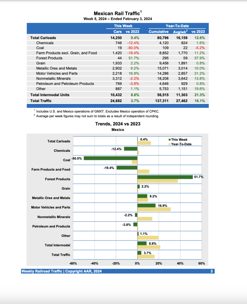 Mexican railroads reported 14,250 carloads for the week, up 0.4% compared with the same week last year, and 10,432 intermodal units, up 8.6%. Cumulative volume on Mexican railroads for the first five weeks of 2024 was 137,311 carloads and intermodal containers and trailers, up 16.1% from the same point last year.