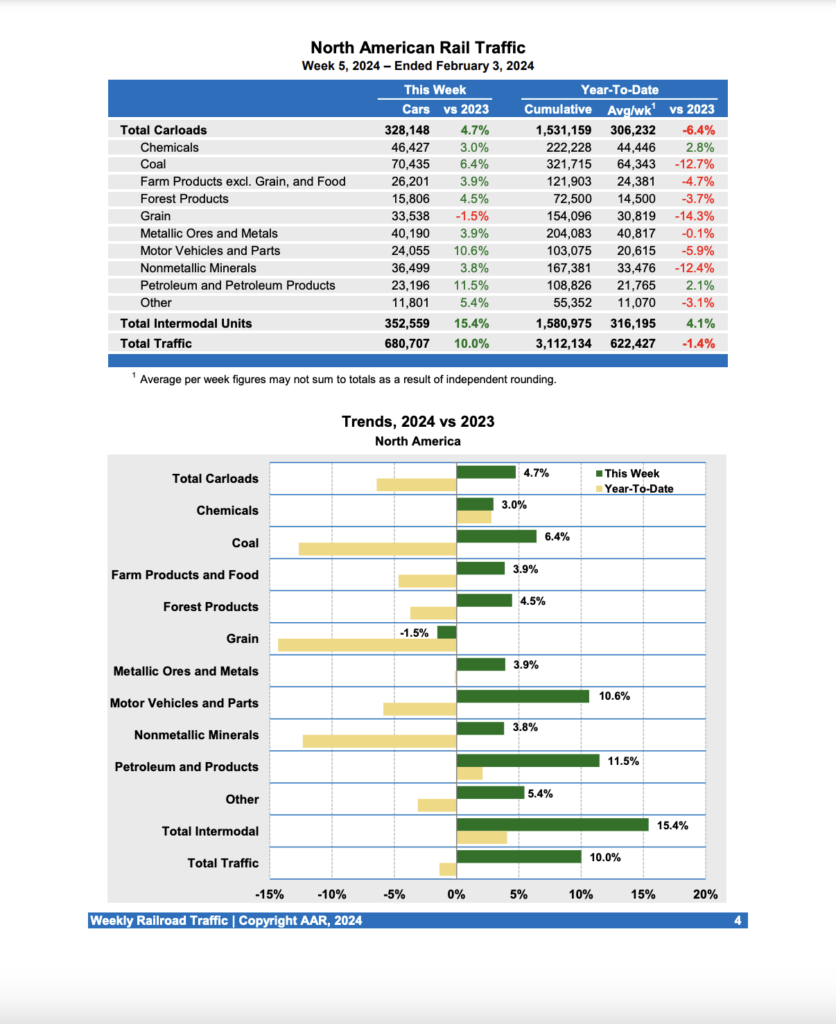 North American rail volume for the week ending February 3, 2024, on 10 reporting U.S., Canadian and Mexican railroads totaled 328,148 carloads, up 4.7% compared with the same week last year, and 352,559 intermodal units, up 15.4% compared with last year. Total combined weekly rail traffic in North America was 680,707 carloads and intermodal units, up 10.0%. North American rail volume for the first five weeks of 2024 was 3,112,134 carloads and intermodal units, down 1.4% compared with 2023.