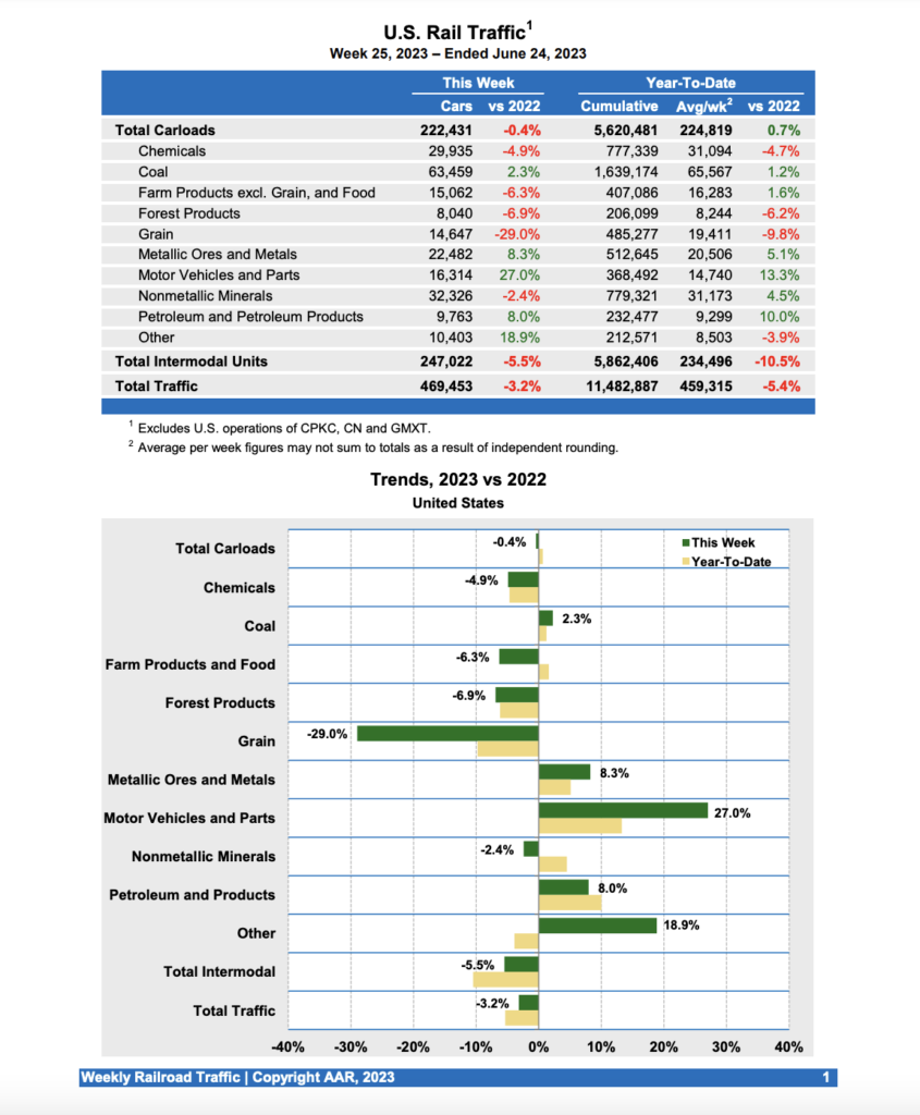 According to AAR, for the week ending June 24, 2023, U.S. Class I railroads hauled a total of 469,453 carloads and intermodal units, falling 3.2% compared with the same week last year. This comprises 222,431 carloads—down 0.4% from the prior-year period—and 247,022 containers and trailers—down 5.5% compared with 2022.