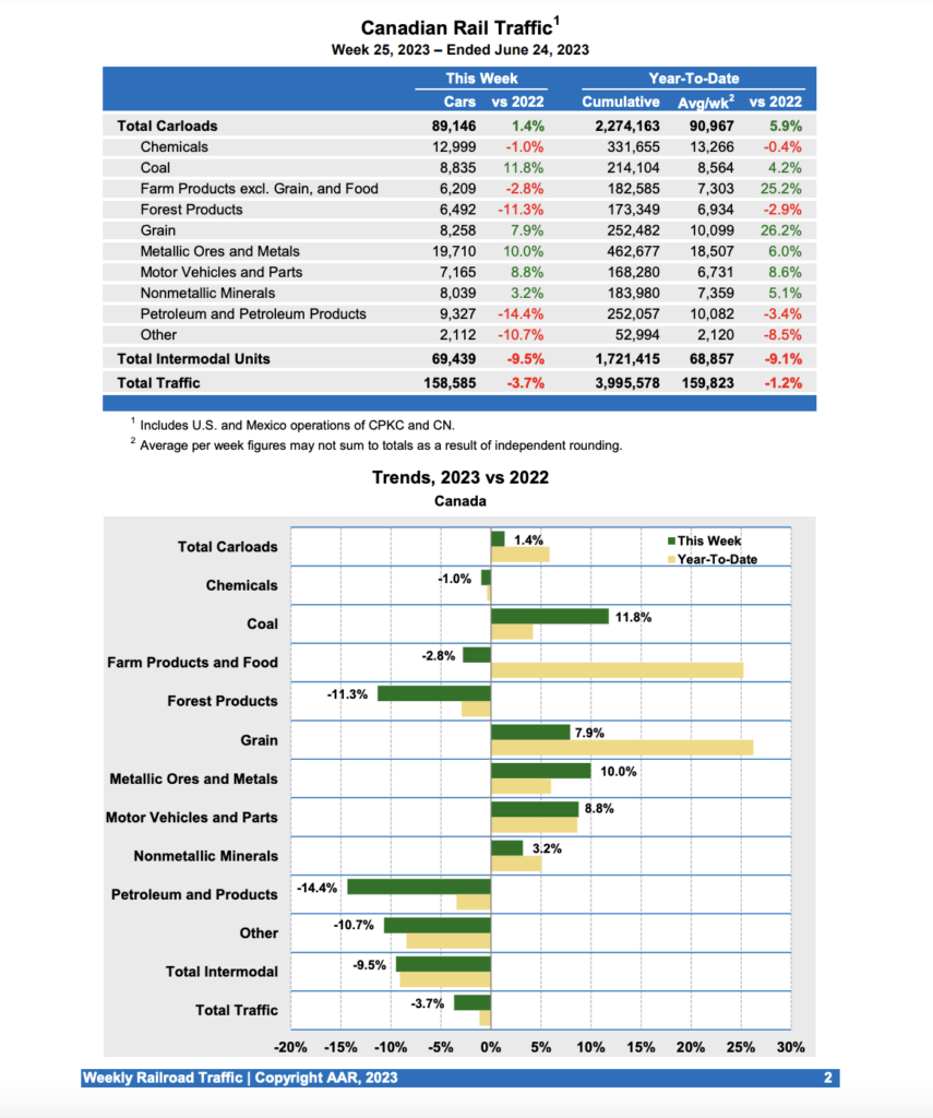 Canadian railroads reported 89,146 carloads for the week, up 1.4%, and 69,439 intermodal units, down 9.5% compared with the same week in 2022. For the first 25 weeks of 2023, Canadian railroads reported cumulative rail traffic volume of 3,995,578 carloads, containers and trailers, down 1.2%.