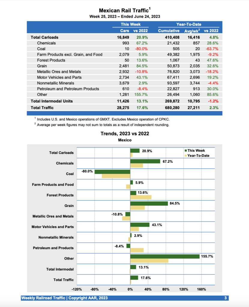 Mexican railroads reported 16,849 carloads for the week, up 20.9% compared with the same week last year, and 11,426 intermodal units, up 13.1%. Cumulative volume on Mexican railroads for the first 25 weeks of 2023 was 680,280 carloads and intermodal containers and trailers, up 2.3% from the same point last year.