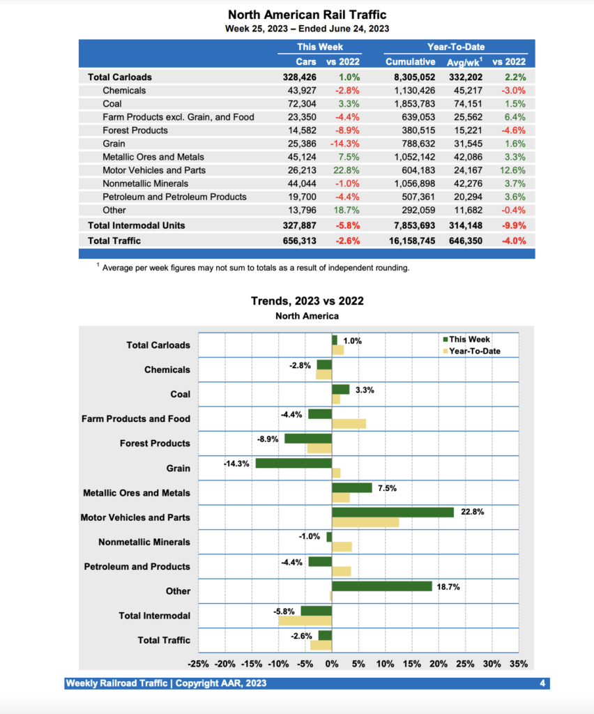 North American rail volume for the week ending June 24, 2023, on 12 reporting U.S., Canadian and Mexican railroads totaled 328,426 carloads, up 1.0% compared with the same week last year, and 327,887 intermodal units, down 5.8% compared with last year. Total combined weekly rail traffic in North America was 656,313 carloads and intermodal units, down 2.6%. North American rail volume for the first 25 weeks of 2023 was 16,158,745 carloads and intermodal units, down 4.0% compared with 2022.