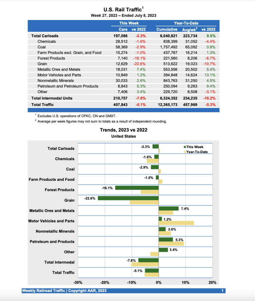 According to AAR, for the week ending July 8, 2023, U.S. Class I railroads hauled a total of 407,843 carloads and intermodal units, falling 5.1% compared with the same week last year. This comprises 197,086 carloads—down 2.3% from the prior-year period—and 210,757 containers and trailers—down 7.6% compared with 2022.