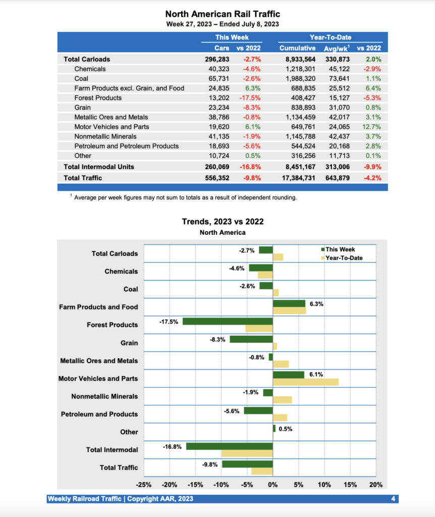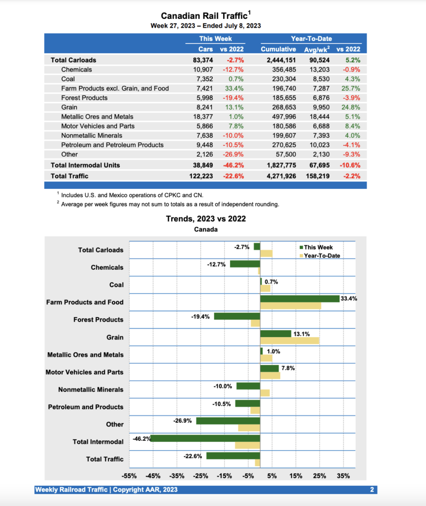 Canadian railroads reported 83,374 carloads for the week, down 2.7%, and 38,849 intermodal units, down 46.2 percent compared with the same week in 2022. For the first 27 weeks of 2023, Canadian railroads reported cumulative rail traffic volume of 4,271,926 carloads, containers and trailers, down 2.2%.