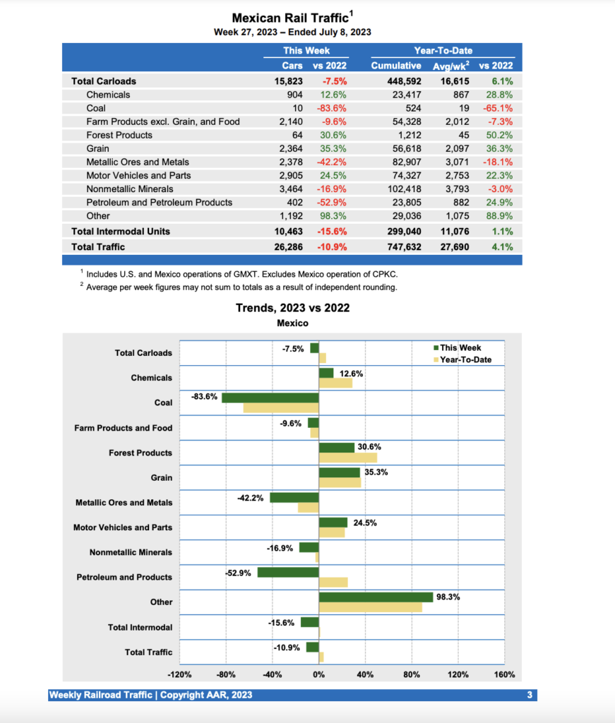 Mexican railroads reported 15,823 carloads for the week, down 7.5% compared with the same week last year, and 10,463 intermodal units, down 15.6%. Cumulative volume on Mexican railroads for the first 27 weeks of 2023 was 747,632 carloads and intermodal containers and trailers, up 4.1% from the same point last year.