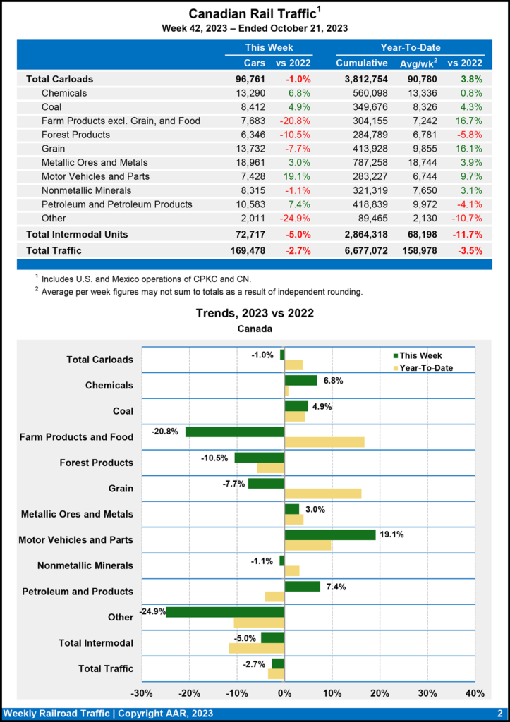 Canadian railroads reported 96,761 carloads for the week ending Oct. 21, 2023, a 1.0% dip, and 72,717 intermodal units, a 5.0% decline from the same week last year.